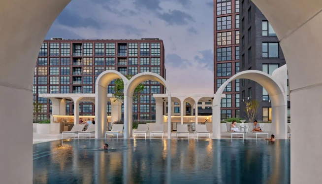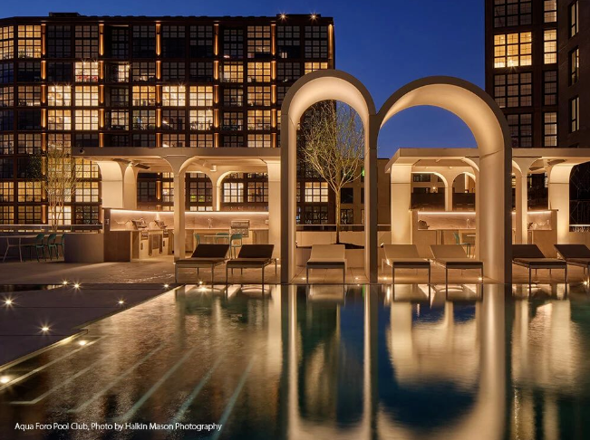 Aqua Foro 位于Northern Liberties现状的四层停车场上方,规模 25,000 平方英尺,是一组屋顶泳池俱乐部及休闲健康主题景观。为相邻的 Piazza Alta 综合用途开发项目提供服务,配有相互连通的大型泳池、温泉浴池、戏水池、取暖火炉、户外餐吧、水中乒乓和休息空间。